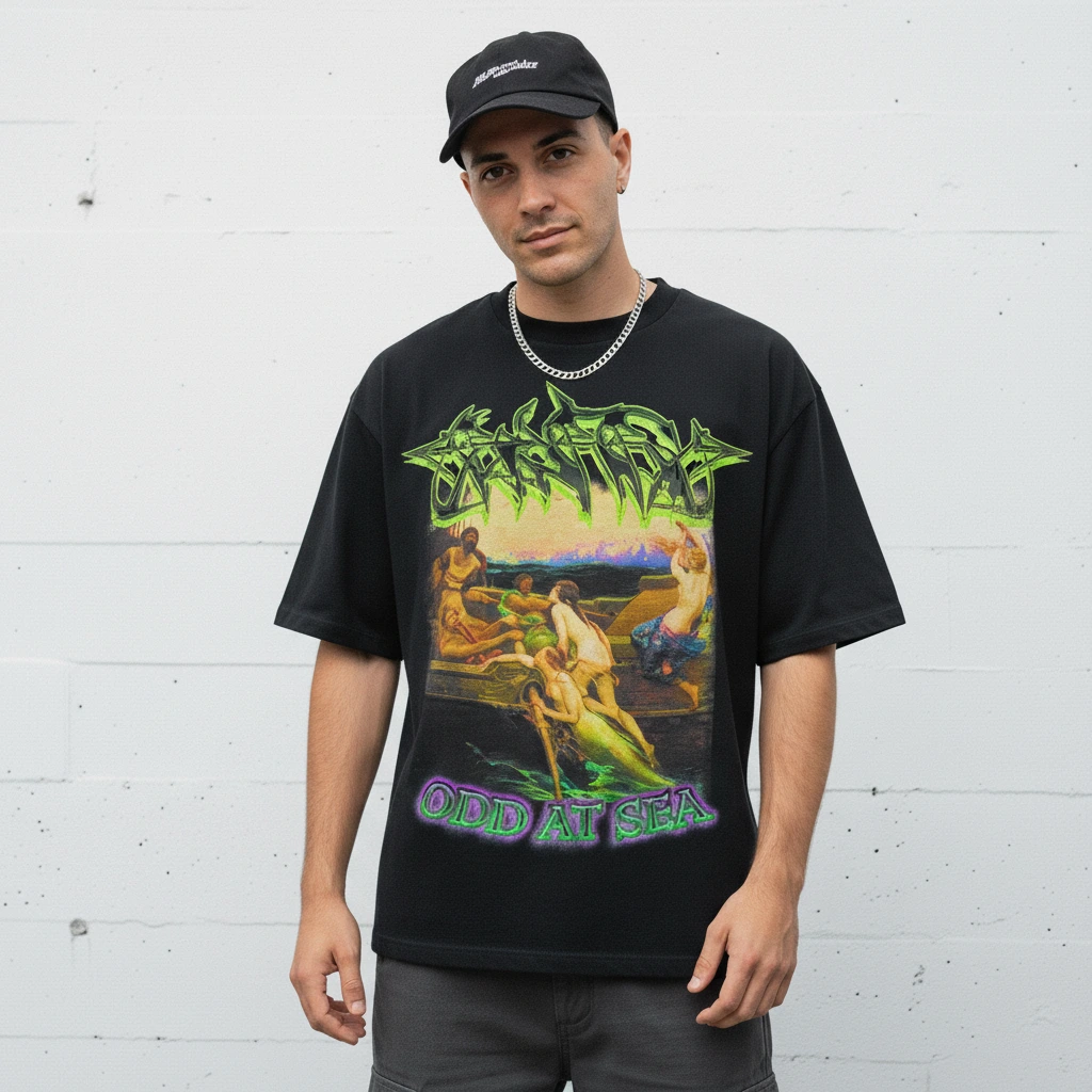 Distorted maritime iconography. Odysseus bound to the mast as his crew rows past the Sirens. High-saturation neon accents on an obsidian base.